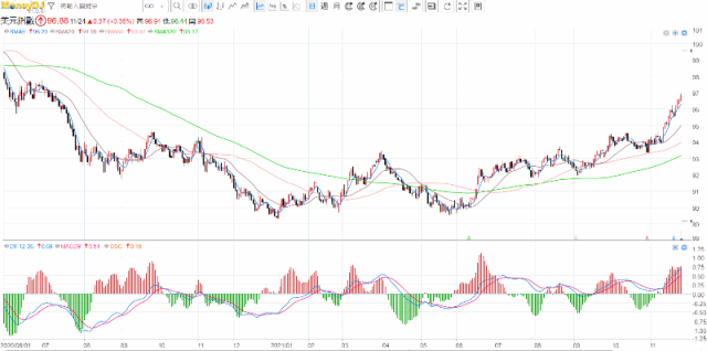 上述消息帶動美元飆高。MoneyDJ iQuote報價顯示,追蹤美元兌6種主要貨幣一籃子匯價的ICE美元指數(US Dollar Index,簡稱DXY)24日終場上漲0.38%、收96.86點,創2020年7月7日以來收盤新高。(見下圖)