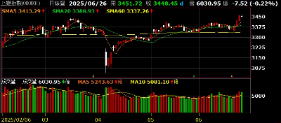 中國滬深兩市三大指數今(26)日開盤持續漲跌不一,在軍工、多元金融延續漲勢/固態電池概念走高,以及醫藥醫療股集體調整、網約車概念陷入回調的交互影響下,滬指開低後轉趨於平盤附近調整,深證成指、創業板指則是呈現明顯震盪;午後,各指數均滑落至平盤下方遊走。滬指終場收跌0.22%(附圖),終止連續3日走揚。
