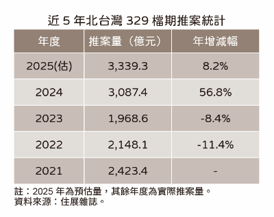住展雜誌發言人陳炳辰分析,觀察歷年329檔期推案資訊,較早之前的高點是2021年的2423.4億元,乃出於史上利率最低檔原由,而突破3000億元大關的則為這兩年,2024年逢股市熱潮帶動,以及前一年平均地權條例修法造成新案延推,遂成熱況,但去年下半年的銀行房貸滿水位危機與央行打炒房政策,打散買氣迄今元氣未癒,部分建商在不明朗態勢下依然於今年放手一搏,原因還是不少大案接待中心、媒體宣傳、銷售人員等費用成本已規劃支付,難再拖延,又在台北市南港區的千億元大案,助攻1/3的量能,一舉推升2025年氣勢。