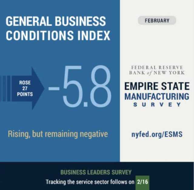 紐約州製造業2月出貨指數自1月的-22.4跳升至0.1、意味著出貨從萎縮轉為擴增。