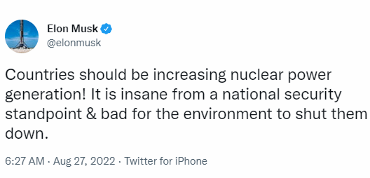 馬斯克甫於8月26日透過Twitter表示,各國應該增加核能發電!為了國安、對環境不友善等觀點將之關閉實在瘋狂。