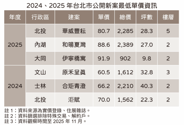 MoneyDJ新聞 2025-11-20 10:52:35 新聞中心 發佈 住展雜誌彙整台北市去(2024)年、2025年公開的住宅類預售新案,截至11月實價揭露的最低單價三案,2024年是文山區政大山區的「原禾呈真」、士林區社子地區的「合矩青澄」,與北投區復興崗一帶的「洰賦」,單價各是60.5萬元、66.2萬元、70萬元;2025年則為北投區復興崗區域的「華威豐耘」、內湖區四期重劃區的「和暘夏灣」,和大同區延三夜市地帶的「伊寧橋寓」,每坪交易80.7萬元、88.6萬元,以及91.9萬元(附表)。