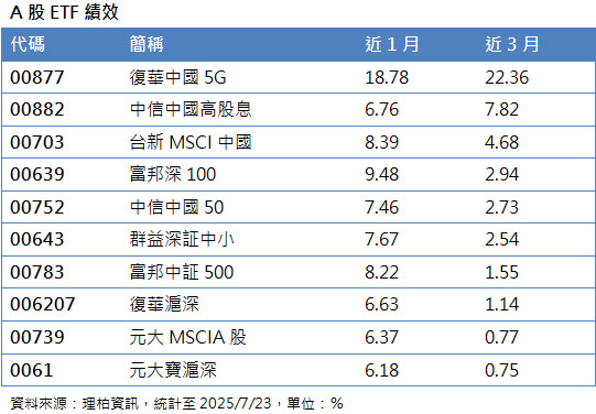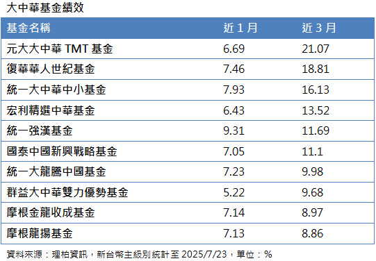 港股恆生、A股上證自4月關稅戰爆發時低點反彈,逐步震盪走高,7月以來更屢創今年來新高,累計近3個月漲幅分別為15.7%、8.7%。理柏資訊統計(截至2025/7/23),元大大中華TMT、復華華人世紀、統一大中華中小、宏利精選中華、統一強漢、國泰中國新興戰略等大中華基金以及復華中國5G(00877)近3個月皆有逾1成報酬,表現相對亮眼。