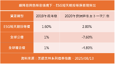 群益投信債券ETF研究團隊表示,短天期債的波動較小,但在降息時同樣也能受惠,回顧2019年降息循環,於2019/7/31至2019/10/30的緩降息期間,ESG短天期投等債指數上漲1.6%,表現較全球公債與全球複合債更佳,而在後續2020/3月至2022/3/16的快速降息至下一次升息期間表現,相較全球公債與全球複合債表現承壓,ESG短天期投等債仍守住正報酬,上漲2.8%,可見在不同降息步調下,短天期債都能發揮其穩健特性。