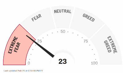 CNN恐懼貪婪指數(CNN Fear & Greed Index)顯示,2月25日美股投資人的態度為「極恐懼」,指標下滑至23點,一週前還在中立區(47點)。