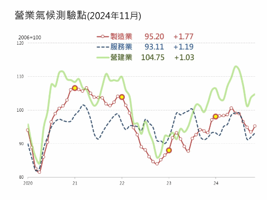 台灣經濟研究院今(25)日發布最新景氣動向,受惠資訊電子業生產動能續強外,傳產生產與出口表現亦有改善,今(2024)年11月製造業營業氣候測驗點升至95.20點(附圖),結束先前連續五個月的下跌;服務業、營建業營業氣候測業點則同步呈現連續第二個月上揚。