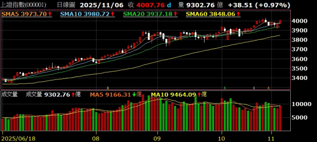 中國滬深兩市三大指數今(6)日集體開高,在電網設備板塊延續強勢、保變電氣(600550.SH)漲停,半導體板塊震盪拉升、海光信息(688041.SH)領漲,以及化工板塊爆發/電解鋁概念表現活躍的帶動下,滬指全日呈現開高走高,今日終場站上4000點、收漲0.97%(附圖),連續二日走揚、日K連2紅,收復5日線、10日線。