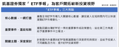 隨著主管機關持續打造多元開放的ETF投資環境,凱基證券以成為「ETF專業券商」的目標,不僅與證基會合作推出獨家「專業ETF顧問(ETFP)」認證培訓,強化服務同仁的專業能力,更打造「ETF季報」針對台灣ETF市場重要事件解析,以中立角度為投資人闡述對未來趨勢發展的潛在影響與意涵,為投資人帶來值得信賴的ETF投資體驗。