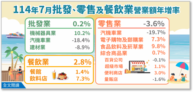陳玉芳並提到,7月零售業營業額不如預期,主要係經濟景氣不確定性還是很高,國人消費動能趨於保守,尤其對高價耐久財消費衝擊較大,且7月下雨天數較多,影響實體店面來客數,多數零售業表現都低於預期,同時氣溫偏低也影響季節性家電銷售業績;不過觀察1-7月零售營業額,若不含汽機車銷售則年增1.3%,顯示消費基本動能仍存,下半年待關稅底定後,可能有助消費信心回升,對於營收成長將有所挹注。