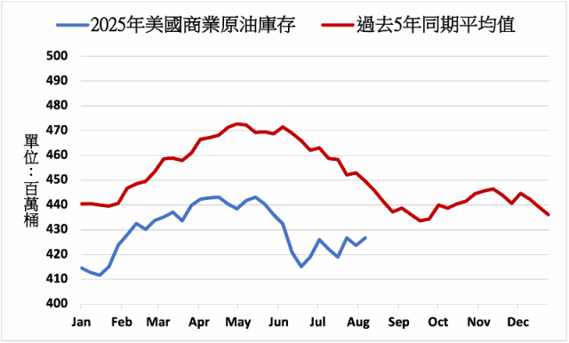 8月8日當週,美國原油日均產量較前週增加4.3萬桶至1,332.7萬桶。美國能源部月報表示,油價下跌導致美國生產商今年放緩了鑽井與完井活動,報告預測2025年與2026年美國原油日均產量分別為1,340萬桶與1,330萬桶。當週美國原油日均出口量較前週的331.8萬桶增加至357.7萬桶。