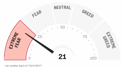 CNN恐懼貪婪指數(CNN Fear & Greed Index)顯示,8月6日投資人態度陷入極恐懼(Extreme Fear),指標來到21點,略高於5日的「極恐懼」(19點),一個月前還在中立區附近(47點)。
