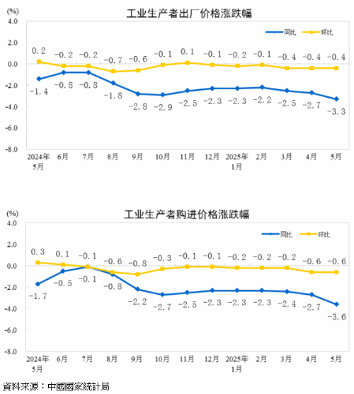 中國國家統計局今(9)日公布,今(2025)年5月全國工業生產者出廠價格(PPI)年減3.3%,降幅較4月擴大0.6個百分點,略遜於路透社調查預估的年減3.2%,創22個月新低;工業生產者購進價格年減3.6%。1-5月平均工業生產者出廠價格和購進價格相較去年同期均下降2.6%。