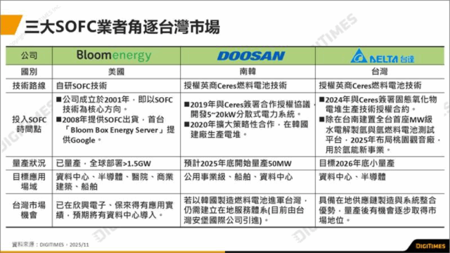 從台灣政策面來看,能源署在推動企業建置定置型燃料電池的部署上, 透過每kW最高7萬元的補助形成助力,業界普遍看好2025年燃料電池的成長性,而目前台灣市場發展形成SOFC三大勢力,包括美商Bloom Energy(BE)、韓商斗山燃料電池(Doosan Fuel Cell)及台達電(2308)。DIGITIMES分析師余佩儒認為,現階段以BE為台灣電子業、資料中心部署SOFC的主導業者,待2026年底台達電量產後,有望取得市場地位。