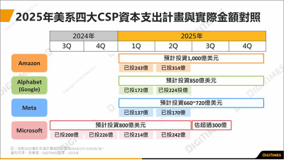 DIGITIMES觀察,四大CSP(雲端服務供應商)亞馬遜(Amazon)、Alphabet、微軟(Microsoft)和Meta於2025年第2季財報會議中,皆樂觀看待未來AI商機。2025年上半四大CSP合計資本支出約1,715億美元,並同步上修全年合計資本支出達3,500億美元以上。展望2026年,四大CSP持續擴大全球投資,但考量公司財務和客戶需求變動,投資立場將轉為穩健,成長幅度將低於前幾年,逐步進入投資穩定期。