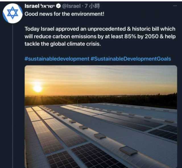 以國環保部長Tamar Zandberg說:「我們設定了重要目標,我們按時履行國際承諾,最重要的是、我們動員了整個政府。」以國外交部指出,2050年國家目標包括運輸部門二氧化碳排放量減少96%、電力部門減少85%以及城市廢棄物部門減少92%。