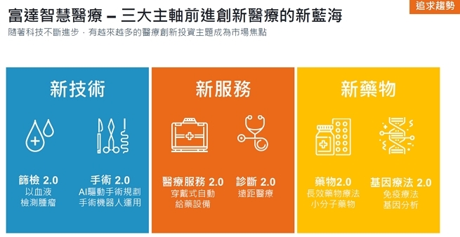 如前所述,全球智慧醫療的發展範疇極大,此基金最為看好的主軸則是「新技術、新服務、新藥物」三大創新領域的醫療藍海。