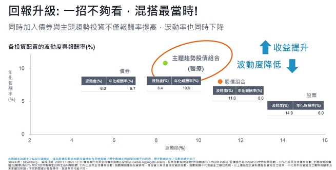 「主題式投資」常能創造穩定的超額報酬機會,但投資人仍不免擔心股票的波動風險。對此,此基金的投組配置有個獨到的設計,即股債比為65比35(上下約有10%的增減空間),可望降低投組的波動程度。而經過試算,股債比65比35的「智慧醫療主題趨勢股債組合」,比起其他純債、純股、或是一般非主題的股債投組,的確能享有較佳的報酬表現、以及較低的波動度(見下圖)。(預定配置比重將隨時間變動,僅供參考使用,不代表基金成立後之投資比例及配置,投資組合應視基金成立之後實際投資配置而定。投資人不應視此為任何投資建議。詳細投資範圍及限制請參閱公開說明書。)