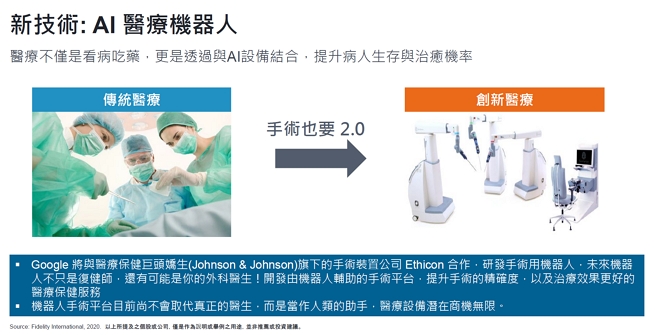 值得一提的是,醫療產業的創新技術,已遠遠超乎大眾的預期與想像。舉例來說,Google將與醫療保健巨頭嬌生旗下的手術裝置公司合作,研發手術用AI機器人,開發機器人輔助的手術平台,可望提升手術的精確度與病患的生存治癒機率,未來手術台旁的外科醫生,很有可能是位AI機器人!