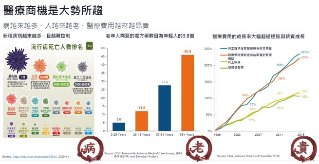 現代人生活中,沒了手機通訊科技會感到恐慌,但身邊如少了醫療服務,那可是會威脅生命存亡的。眾所周知的,近年來新種流行病、文明病愈來愈多,人也愈活愈長壽,對醫療藥品處方籤的需求更加強烈。以美國為例,根據統計,1999年以來,民眾的醫療費用成長率大幅超越通膨與薪資、幅度高達200%以上,預料此趨勢只會持續往上,往下修正的機率微乎其微。