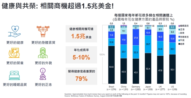 除此之外,科技的日新月異,也讓全球的醫療商機從過往多限於「傷病治療」、「疾病控制」,逐漸往「促進人類健康」更多元的觸角發展,像是追求更好的營養、睡眠品質、身體素質、外貌、心理正念等,這類的「健康商機」預計年化成長率達5%至10%,總計超過1.5兆美元。未來十年、甚至更長遠的時間內,智慧醫療與健康促進產業,絕對是不可錯過的主題趨勢財。(資料來源: McKinsey Future of Wellness Survey, August 2020)