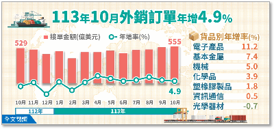 經濟部統計處今(20)日公布10月外銷訂單統計數據,隨全球經濟緩步成長,人工智慧(AI)、高效能運算及雲端產業等商機持續擴增,推升10月外銷訂單達554.5億美元,月增3.1%、年增4.9%(左圖),為歷年同期次高、連續8個月正成長,同時各大貨品接單多呈正成長;累計今年1-10月外銷訂單4,843.5億美元、年增3.8%,為歷年同期第三高。