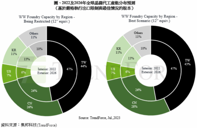 MoneyDJ新聞 2023-07-05 15:00:22 記者 新聞中心 報導 針對6月30日荷蘭發布的先進製程設備出口管制細則,TrendForce認為,即便受到美日荷出口管制影響,中國晶圓代工12吋約當產能市占率仍將由去(2022)年24%,預估增長至2026年26%。此外,若40/28nm設備出口最終仍將取得許可,預估中國晶圓代工12吋約當產能市占率仍有機會在2026年擴張至28%,成長規模仍不容忽視。