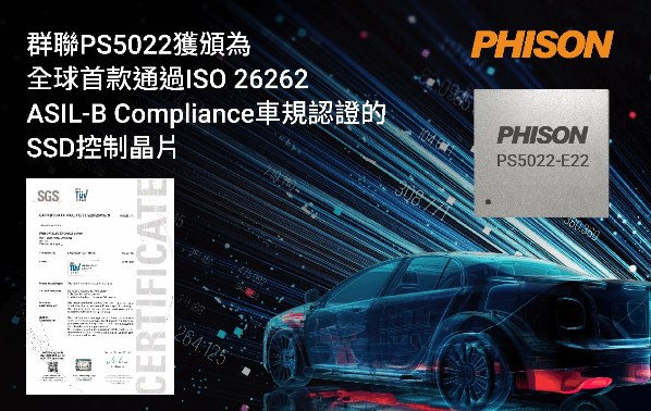 NAND控制晶片廠群聯(8299)宣布,旗下專為車載系統打造的PCIe Gen4x4 PS5022控制晶片成為全球首款通過ISO 26262 ASIL-B Compliance認證的SSD控制晶片。此認證是目前針對NAND產業的最高等級功能安全(Functional Safety, FuSa)標準,展現群聯在車用市場的深厚布局與技術領先地位。