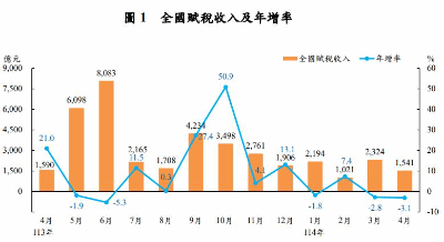 財政部公布4月全國稅收實徵淨額1,541億元,以證交稅減少80億元、營所稅減少70億元較多,惟綜所稅增加59億元、營業稅增加48億元,其中牌照稅創下歷史新高,關稅、綜所稅、特銷稅(奢侈稅)為同期新高;累計前4月實徵淨額7,080億元,以證交稅減少132億元、營所稅減少85億元、土地增值稅減少40億元較多,惟綜所稅增加187億元,而創同期新高稅目包含關稅、綜所稅、期交稅、奢侈稅、營業稅、牌照稅與娛樂稅。