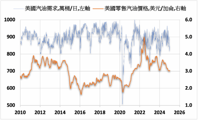 美國能源部報告表示,2024年,美國普通汽油的零售價格平均為每加侖3.30美元,較2023年下跌了0.21美元/加侖,原油價格較低以及煉油廠利潤縮小是美國汽油零售價格下降的主要原因。與2023年相比,2024年的價格波動範圍較小,這反映了原油價格的相對穩定。
