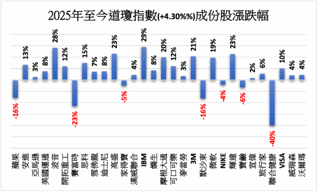 道瓊指數前5大權重股當中,高盛(權重9.76%)下跌0.59%,微軟(權重6.90%)上漲0.37%,開拓重工(權重5.62%)下跌0.59%,家得寶(權重5.14%)下跌0.87%,Visa Inc.(權重4.90%)下跌2.23%。