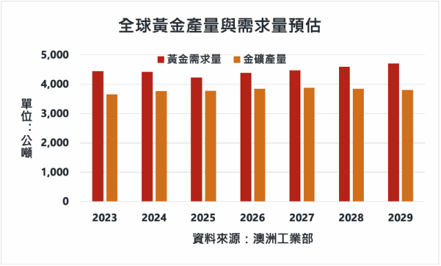 澳洲工業部報告預估,從2026年開始,世界黃金消費量將以每年2.7%的速度成長,到2029年將達到4,700公噸,這段期間的需求成長將主要受到金飾消費成長的推動,投資需求和高科技製造業界也將逐步成長。預計從2026年起,金飾消費量將平均每年增長4.4%,到2029年將達到2,550公噸,包括消費者信心改善和收入增加將支撐消費,尤其是在中國和印度兩大黃金市場。