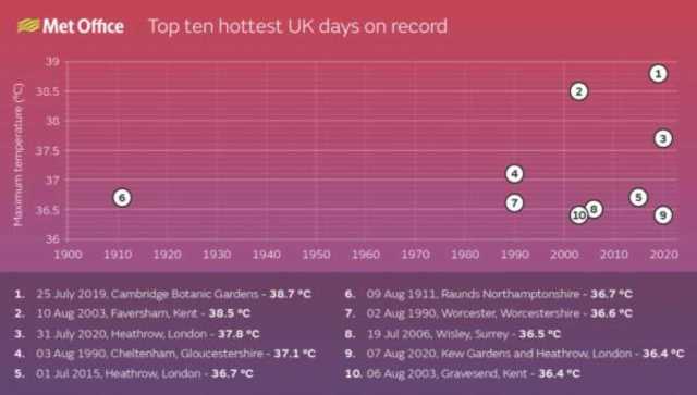 Thomson Reuters報導,英國將於週一(7月18日)迎來史上最熱的一天、氣溫將首度突破攝氏40度,週一、週二預估都將超越2019年劍橋大學植物園出現的攝氏38.7度舊紀錄。
