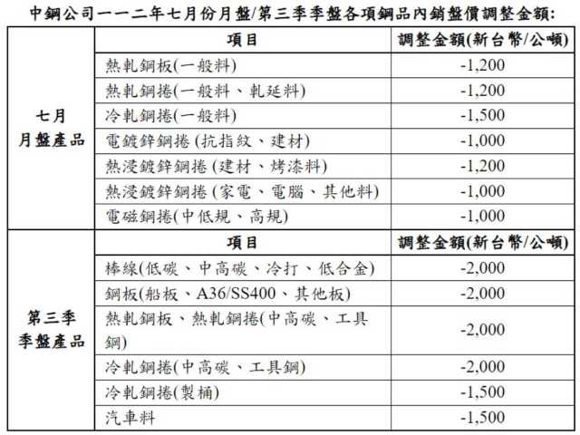中鋼(2002)今日開出7月份月盤/第三季季盤鋼品內銷盤價(見附圖),所有商品皆調降。月盤部分,主要商品熱軋鋼板及鋼捲每噸降1200元,冷軋鋼捲每噸降1500元,其餘每噸調降1000~1200元不等(附圖),季盤各鋼品則調降1500~2000元不等。