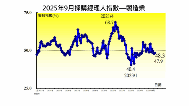 中經院表示,因對等關稅衝擊發酵以及國際景氣仍存不確定性,9月經季節調整後之台灣製造業PMI已連續4個月緊縮,惟9月指數微幅回升0.4個百分點至48.3%。五項組成指標中,經季調之新增訂單、生產與人力僱用持續緊縮,供應商交貨時間上升(高於50.0%),存貨持續緊縮。