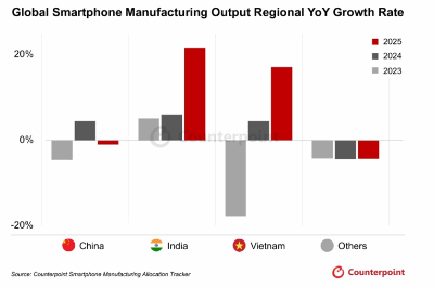 報告顯示,中國預期將在2025年受到關稅影響,導致產量減少,加上中國國內市場表現不振,將對整體製造規模造成壓力。Counterpoint Research資深分析師Ivan Lam表示,疫情之後,手機品牌商積極重新調整全球製造布局,而關稅政策的推動更加速了產線外移的趨勢;其中,印度與越南因具備相對優勢,成為產能擴展與布局轉移的主要受惠市場。