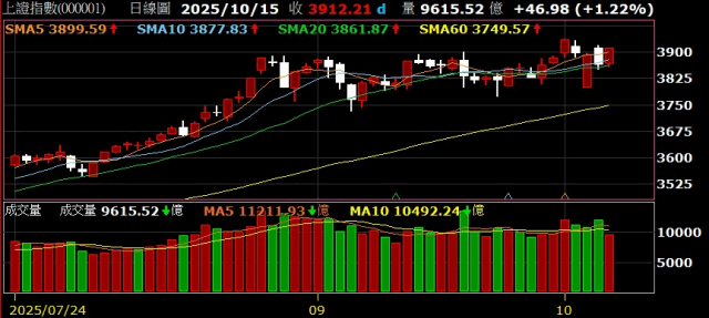 中國滬深兩市三大指數今(15)日持續集體開高,惟在能源金屬開盤拉升、盛新鋰能/寒銳鈷業領漲,稀土永磁板塊探底回升,以及軍工板塊下挫,光刻機/風電設備板塊調整的交互影響下,滬指轉趨平盤附近震盪;午後,在日股及美股電子盤連袂走強下,帶動機器人概念爆發/五洲新春等漲停、汽車概念股走強,輔以創新藥板塊持續活躍下,滬指終場再度站上3900點,收漲1.22%(附圖),終止連續三日下挫,日K翻紅、重返5日、10日線。