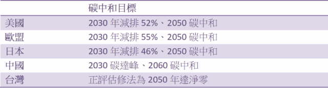 國際間對2050達成碳中和已取得一定共識,例如美國宣布2030年減排52%、2050碳中和;日本規劃2030減排46%、2050碳中和;歐盟規劃2030減排55%、2050碳中和。中國則預計2030碳達峰、2060碳中和;台灣過去僅規畫2050年碳排量要回到2005年的一半,與國際間腳步有落差,而今年4月政府則表示,正評估將目標升級至2050年達到淨零轉型。
