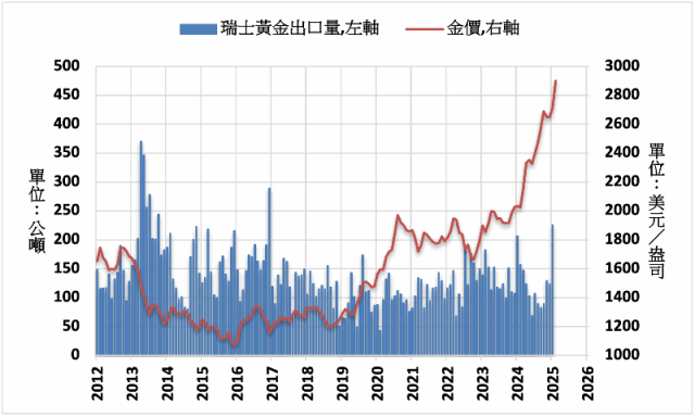 2025年1月,瑞士對美國的黃金出口量較前月的64.25公噸大增至192.9公噸,創下2012年數據統計以來的月度新高,成為瑞士第一大黃金出口市場,因對川普關稅威脅的擔憂令大量黃金運往美國。相比2024全年,瑞士對美國黃金出口量年增69%至102公噸。