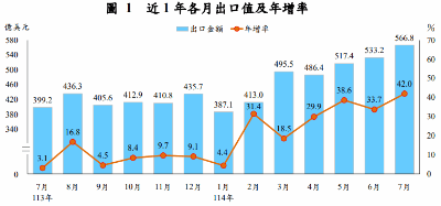 財政部今(8)日公布7月海關進出口貿易初步統計,7月出口566.8億美元,連續三個月創下歷史新高,月增6.3%、年增42%(左圖),年增幅度亦創15年來最強增速,並且是連續21個月正成長;累計今(2025)年前7月出口3,399.4億美元、年增28.3%。7月進口423.4億美元,為歷年單月次高,月增2.6%、年增20.8%;累計前7月進口2,698.9億美元、年增20.5%。