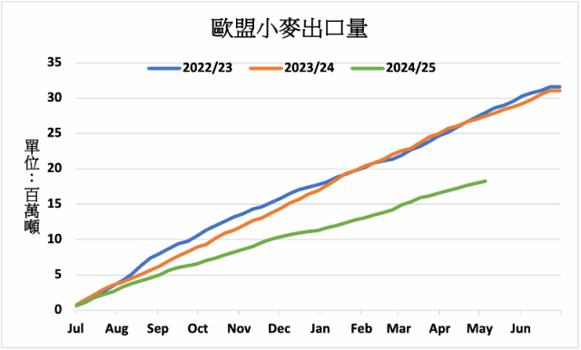 歐盟執委會5月13日公布,截至5月11日,去年7月起的歐盟2024/25年度小麥出口量累計為18,257,169公噸,較上年同期的27,414,123公噸減少33%。大麥出口量累計為4,218,238公噸,較上年同期的5,429,808公噸減少22%。玉米出口量累計為1,952,941公噸,較上年同期的3,602,787公噸減少46%。歐盟2023/24年度小麥出口量年減2%至3,100萬噸,玉米出口量年增7%至395萬噸。