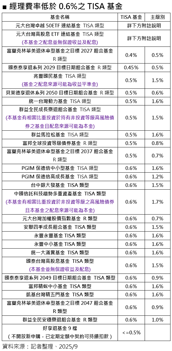 目前基富通上架的TISA基金將近70檔,其中,半數以上基金的經理費率更低於0.6%,甚至媲美ETF。此外,平台上還有「好好退休」專案的境外基金,同樣有專家篩選把關,且經理費率低於1%,投資範圍涵蓋全球股市與產業,補強TISA主要投資國內的不足之處,滿足民眾一站理財的需求。