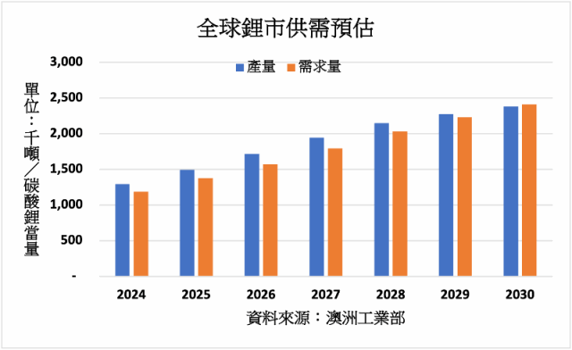 澳洲工業部報告表示,全球鋰需求預計到2030年將以接近每年13%的速度增長,主要受到電動車普及與電池儲能系統部署日益擴大的驅動。目前全球鋰市場的供應過剩預計將在預測期內逐步減弱,並在2030年前實現供需平衡的改善。全球的精煉產能與下游需求預計仍將高度集中在中國。