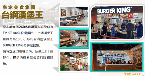 公司分別於2021年及2024年5月取得台中知名宴會百匯品牌-潮港城之經營權以及台鋼漢堡王Burger King之特許經營權。