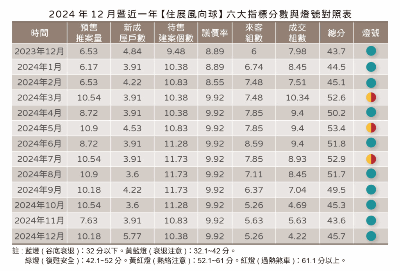 代表北台灣新建案市場概況的「住展風向球」,2024年最後一個月燈號連五綠,分數45.7分,較前兩個月微高,風向球六大構成項目呈現「二升、一平、三降」,預售屋推案量、新成屋戶數上升,待售建案數、來客組數、成交組數分數下降,議價率持平。