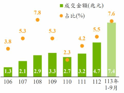 ETF因具備資訊透明、適合小額投資等特性,進入門檻低,近年交易市場蓬勃發展。上市上櫃ETF成交金額自2017年1.3兆元逐年上升至2020年3.3兆元,占整體上市上櫃成交值於2019年升抵7.8%高點,2021年因航運題材發酵及科技業受惠疫情紅利,相關類股價量齊揚產生磁吸效應,ETF成交金額回落至2.7兆元,占比亦減至2.3%,2022年後ETF市場重回成長軌道,今年隨台股站上2萬點大關、高股息ETF熱銷,1-9月成交金額已達7.4兆元。