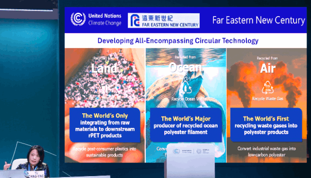 遠東集團元智大學尤淨纓副教授在此次大會演說時提到,遠東新深耕回收聚酯產業超過三十年,將企業核心能力應用於各種創新與再生技術開發,發展以「陸、海、空」廢棄物為再生原料來源的綠色技術,與全球品牌客戶共創永續價值,建構可持續發展的循環生活圈;回收再生事業從台灣擴展到美國、日本、中國大陸、越南、菲律賓、馬來西亞等。
