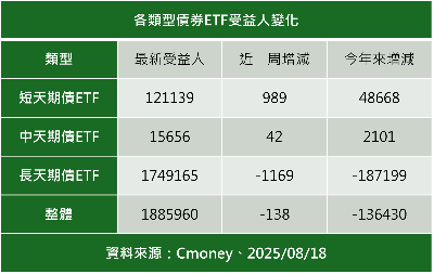 MoneyDJ新聞 2025-08-21 16:28:36 新聞中心 發佈 根據集保中心最新公布的債券ETF受益人數統計,近一周債券ETF(不含槓反型與主動型)受益人數減少138人,總人數來到188萬5,960人,其中以長天期債ETF減少1169人最多,短天期債ETF則最受青睞,周增989人。而若以今年來人數增減來看,也以短天期債ETF增加4萬8668人最多,可見在今年聯準會降息節奏難料下,可見同樣能提供穩健收益,但存續期間短,對利率敏感度較低、波動較小的短天期債ETF吸引投資者注意。