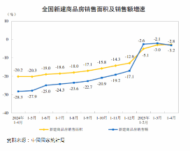 中國國家統計局今(19)日公布,今(2025)年1-4月新建商品房銷售面積2億8,262萬平方米、年減2.8%,續呈負成長,降幅較1-3月收斂0.2個百分點;其中,住宅銷售面積下降2.1%,降幅擴大0.1個百分點。1-4月新建商品房銷售額2兆7,035億元(人民幣,下同)、下降3.2%,降幅擴大1.1個百分點;其中,住宅銷售額下降1.9%。截至4月底,商品房待售面積7億8,142萬平方米,較3月底減少522萬平方米;其中,住宅待售面積減少455萬平方米。
