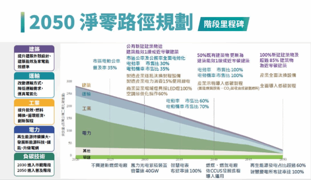 根據國發會所公布路徑圖規劃,將以氫能、節能、碳捕捉、電力系統及儲能等12項關鍵戰略,以期達到淨零目標。同時,預計2050年再生能源發電占比將提高至60~70%,而氫氣則占9~12%,此投資計畫可望帶動4兆元以上的民間投資。