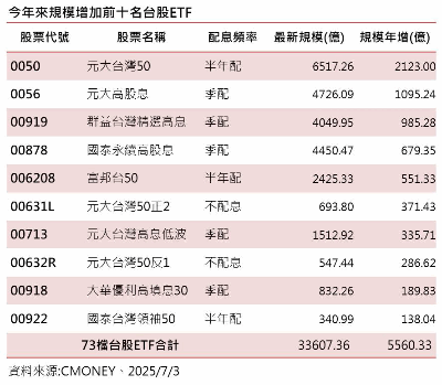 MoneyDJ新聞 2025-07-03 17:00:09 記者 丁于珊 報導 台股進入下半年就傳來佳績,73檔台股ETF規模創下新高,整體規模來到3.36兆、領先大盤創下新高,統計今年來共增加5560.33億元。進一步觀察今年來規模增加前十大台股ETF,其中以0050規模增加2123億元最多(左表),0056元大高股息、00919群益台灣精選高息分居第二、三名。整體來看,規模增加前十名中包括0056、00919、00878、00713、00918共5檔高息季配型都有上榜。顯示出投資人還是對季配型台股高息ETF有所偏愛。